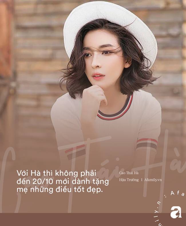 Cao Thái Hà chia sẻ: "Hôm đó Hà sẽ gọi điện về để nói chuyện với mẹ và mua cho mẹ món quà mà bà thích. Với Hà thì không phải 20/10 Hà mới dành tặng mẹ những điều tốt đẹp, vì khoảng thời gian ba bệnh, Hà đã tập trung lo cho ba và giờ là lúc dành tất cả cho mẹ. Ngoài việc trách nhiệm với gia đình, Hà còn muốn làm nhiều điều tốt đẹp hơn cho cuộc sống của mẹ và em trai.