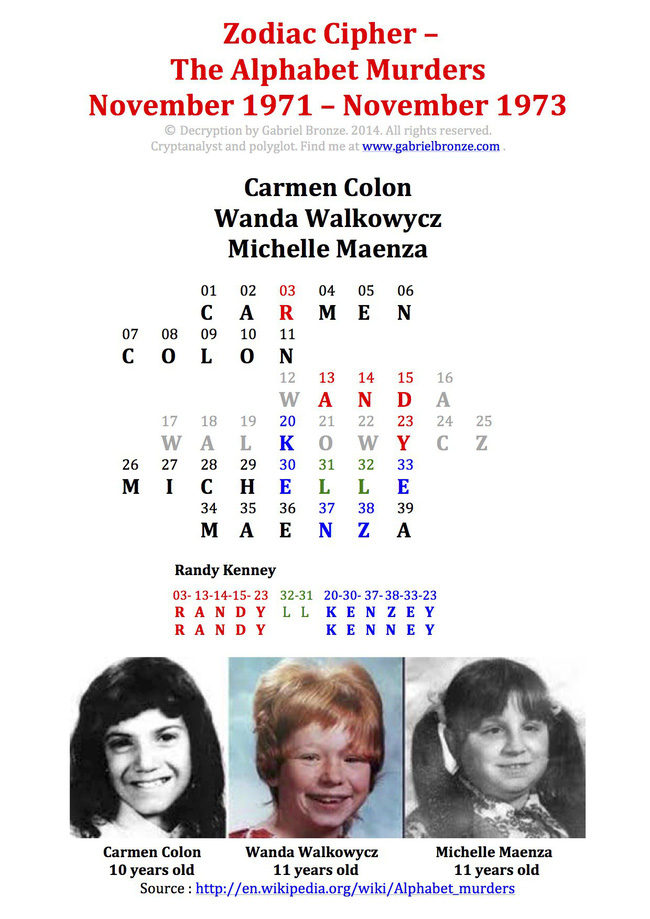 Cảnh sát và truyền thông gọi đó là "vụ giết người theo bảng chữ cái" vì một đặc điểm trùng hợp kỳ lạ trong tên của các nạn nhân. Cả 3 bé gái đều ở độ tuổi trên 10 tuổi. Kể từ khi vụ án được truyền thông đưa tin, người dân Mỹ đã coi đây là một trong những bí ẩn lớn nhất lịch sử của họ. Chỉ trong vòng 3 năm từ 1971 tới 1973, ba nạn nhân đã bị giết hại dã man theo cùng một kịch bản - bắt cóc, hãm hiếp rồi giết ngay sau đó. Điều khiến nhiều người rợn tóc gáy chính là bởi chữ cái đầu trong họ và tên của các bé gái đều giống nhau.