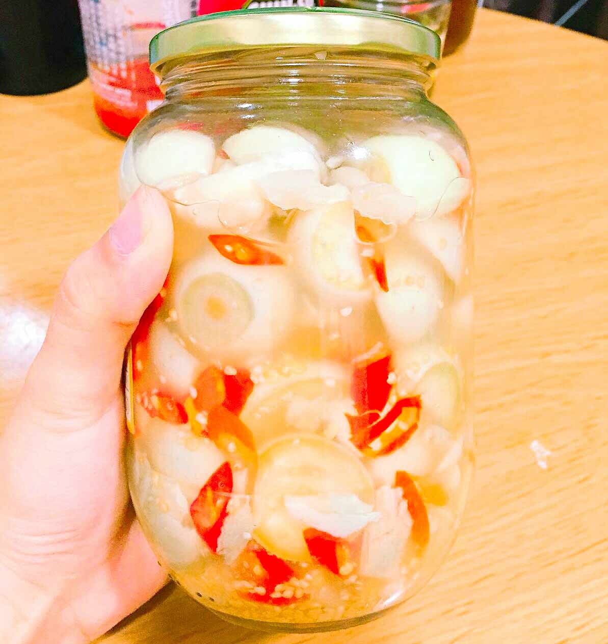 - Hủ thủy tinh rửa sạch, để khô nước, bạn cũng có thể dùng hũ sành, sứ để muối nhé. Rắc vào dưới đáy hũ một lớp muối mỏng và tỏi đập dập, xếp lớp cà lên trên, rải thêm vài lát ớt đỏ cho hũ cà thêm hấp dẫn và có vị cay nồng nhẹ, cứ làm thế cho đến hết.