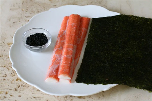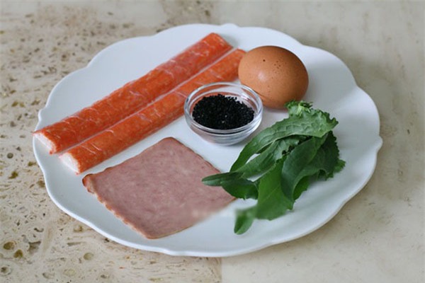 Bạn dùng 2 hạt mè đen làm đôi mắt, cắt miếng giăm bông 2 hình tròn nhỏ gắn hai bên làm má hồng, cắt thanh cua làm đôi môi.