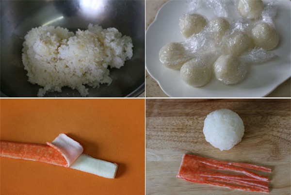 Cắt phần thanh cua màu hồng thành những đoạn có chiều dài gấp đôi đường kính của viên cơm, cắt tua rua dọc theo chiều dài của các tấm thanh cua vừa cắt. Bạn lấy viên cơm tròn ra khỏi tấm nilon.
