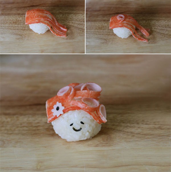 Trang trí cho mái tóc xoăn thêm yêu một bông hoa nhỏ được cắt từ phần thanh cua trắng. Tương tự, bạn trang trí mái tóc cho những viên cơm tròn còn lại.