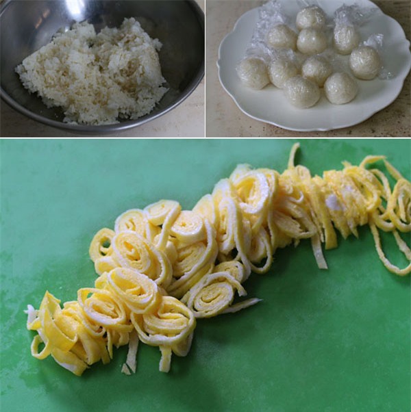 Tiếp theo, trứng chín, bạn cuộn tròn và cắt thành sợi.