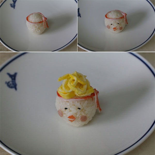 Cuối cùng, đặt những sợi trứng lên trên viên cơm làm tóc xoăn.