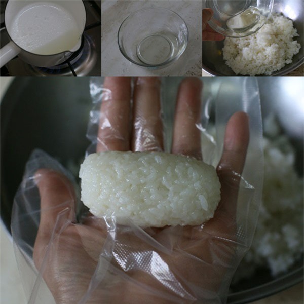 Đầu tiên, bạn cho cơm nóng vào trong bát cùng với gia vị rồi trộn đều, tùy vào số lượng người ăn bạn làm nhiều cơm hay ít cơm. Sau khi trộn cơm xong, bạn lấy một ít cơm bỏ vào tấm nilon nhỏ rồi vo tròn xoắn túm đầu nilon để giữ dáng cho viên cơm tròn không bị vỡ.