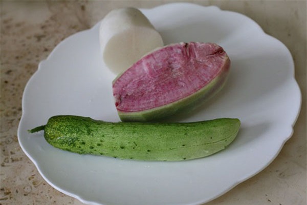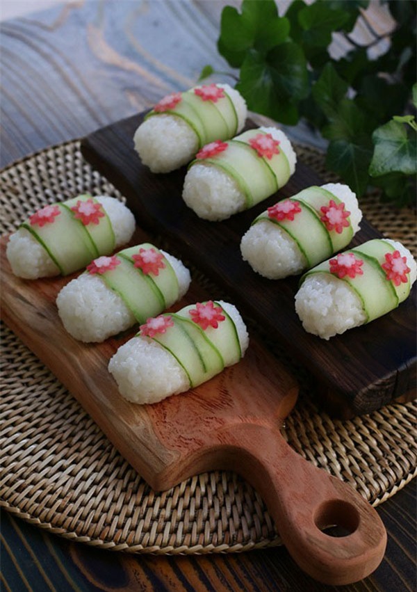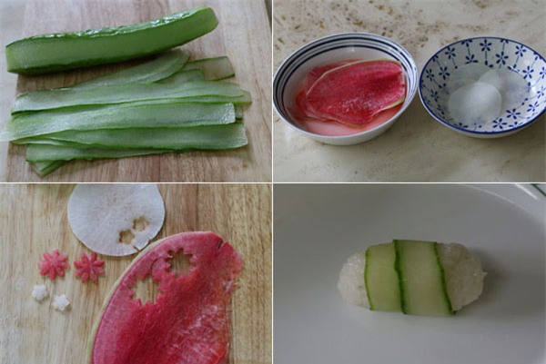 Dưa leo, bạn rửa sạch cắt bỏ hai đầu, thái lát mỏng dọc theo chiều dài của trái dưa. Bạn trộn ít đường, muối và giấm vào trong chén, thái lát củ cải trắng và củ cải hồng bỏ vào chén nước vừa pha ngâm 10 phút. Bạn dùng dụng cụ cắt tạo hình bông hoa nhỏ với lát của cải trắng, bông hoa lớn với lát củ cải hồng. Tiếp đến, lấy lát dưa leo cuộn tròn xoắn bên ngoài viên cơm. Thực hiện cuộn dưa leo cho những khối trụ cơm còn lại.