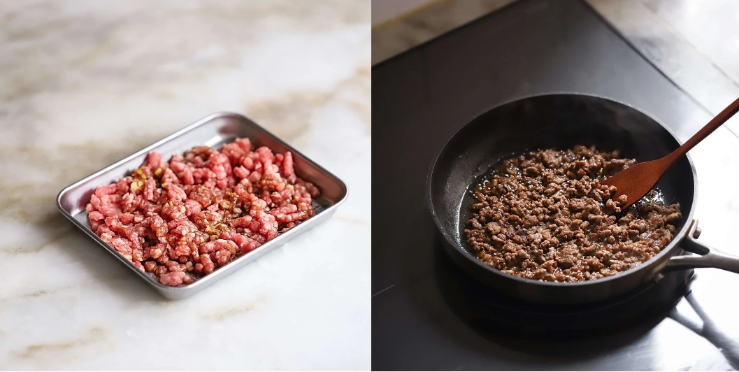 Bước 1: Dưa chuột rửa sạch, đem thái sợi. Cho dưa chuột vào bát, rắc chút muối và trộn đều. Rau mầm rửa sạch. Cho phần gia vị trộn vào bát, trộn đều. Trộn thịt bò băm với phần gia vị ướp thịt. Bạn cho một chút dầu ăn vào chảo, đổ thịt bò vào xào chín tới ở mức lửa lớn rồi trút ra bát.