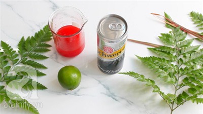 Hoà syrup dâu + nước chanh sau đó thêm soda vào.