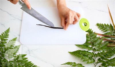 Quả vanila cắt đôi, nạo lấy phần hạt bên trong ra.