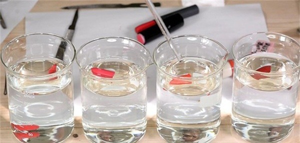 Nhiều thí nghiệm đưa ra cho thấy, tất cả các loại son đều không thể hòa tan trong nước mà đều đóng váng chính vì thành phần là sáp và dầu của son.