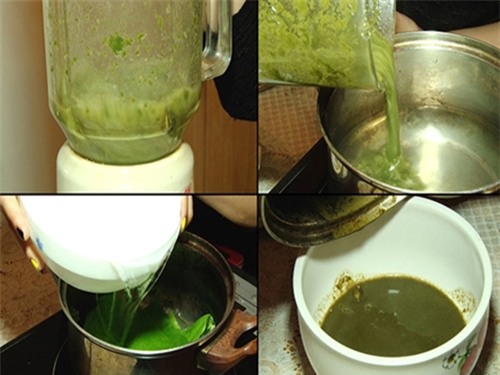 - Bỏ lá trầu không đã xay vào nồi nước luộc rồi đun cho đến khi được hỗn hợp sền sệt.
