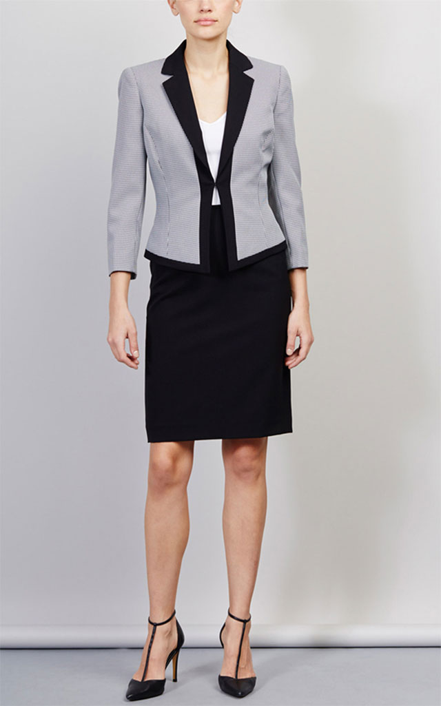 Bộ suit nữ cao cấp màu ghi kẻ xanh tím nền nã hoàn thiện vẻ ngoài thanh lịch của phái đẹp. Thiết kế áo chít eo, chân váy bút chì vừa trẻ trung vừa tôn dáng.