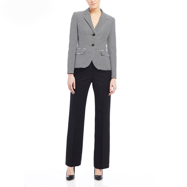 Họa tiết kẻ ngang bắt mắt kết hợp cùng quần ống đứng đen lịch sự và nổi bật. Chị em có thể mặc lót áo 2 dây, áo thun hay áo len để giữ ấm mà không ảnh hưởng đến vẻ quyến rũ của set đồ.