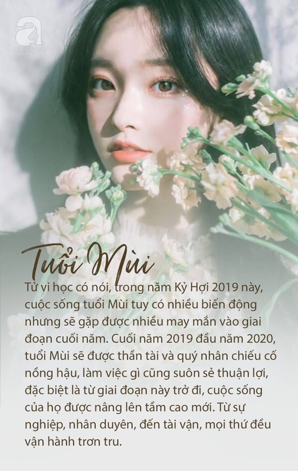 Tử vi học có nói, trong năm Kỷ Hợi 2019 này, cuộc sống tuổi Mùi tuy có nhiều biến động nhưng sẽ gặp được nhiều may mắn vào giai đoạn cuối năm. Cuối năm 2019 đầu năm 2020, tuổi Mùi sẽ được thần tài và quý nhân chiếu cố nồng hậu, làm việc gì cũng suôn sẻ thuận lợi, đặc biệt là từ giai đoạn này trở đi, cuộc sống của họ được nâng lên tầm cao mới. Từ sự nghiệp, nhân duyên, đến tài vận, mọi thứ đều vận hành trơn tru. Có thể không được giàu có như mong muốn nhưng ít nhất cũng dư dả của cải, sống sung túc đến vài năm sau.