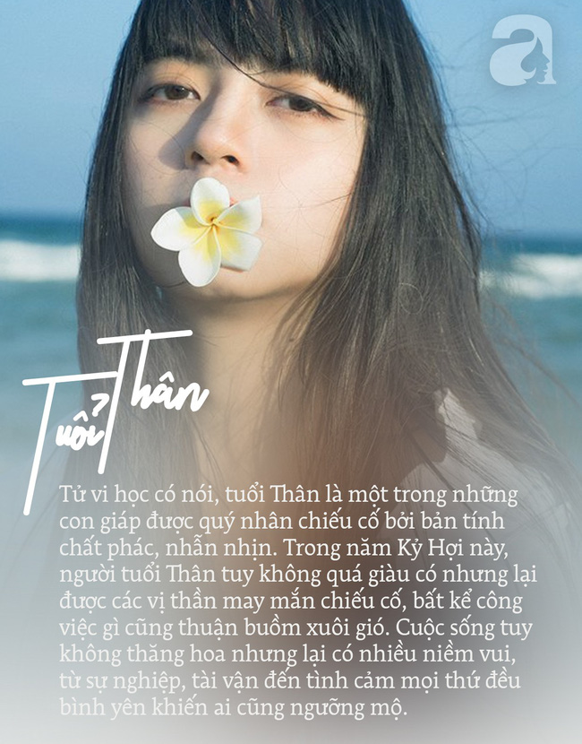 Trời sinh tuổi Thân là những người hiền lành, biết quan tâm người khác, chăm chỉ và không quản ngại những việc khó khăn. Người tuổi Thân không quá tham vọng nhưng họ muốn tự vượt qua chính mình và tạo được thành quả khiến bản thân cảm thấy hài lòng. Tử vi học có nói, tuổi Thân là một trong những con giáp được quý nhân chiếu cố bởi bản tính chất phác, nhẫn nhịn. Trong năm Kỷ Hợi này, người tuổi Thân tuy không quá giàu có nhưng lại được các vị thần may mắn chiếu cố, bất kể công việc gì cũng thuận buồm xuôi gió. Cuộc sống tuy không thăng hoa nhưng lại có nhiều niềm vui, từ sự nghiệp, tài vận đến tình cảm mọi thứ đều bình yên khiến ai cũng ngưỡng mộ. Nhìn chung, trong năm nay tuổi Thân không mưu cầu nhiều thì sẽ được hưởng nhiều, dự kiến cuối năm sự nghiệp có bước đột phá, tiền bạc dư dả, sống sung túc đến vài năm sau.