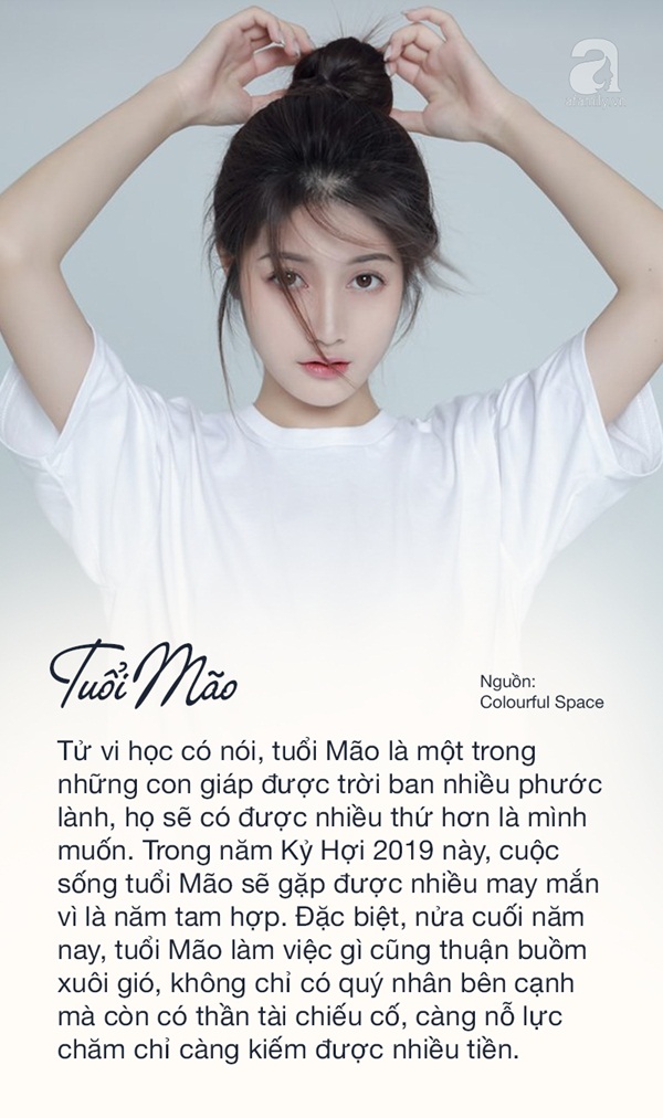 Trong năm Kỷ Hợi 2019 này, cuộc sống tuổi Mão sẽ gặp được nhiều may mắn vì là năm tam hợp. Đặc biệt, nửa cuối năm nay, tuổi Mão làm việc gì cũng thuận buồm xuôi gió, không chỉ có quý nhân bên cạnh mà còn có thần tài chiếu cố, càng nỗ lực chăm chỉ càng kiếm được nhiều tiền. Đối với những người làm ăn kinh doanh, thời gian tới đây tuổi Mão sẽ gặp được cơ hội tốt để xây dựng sự nghiệp vững chắc ổn định. Dự kiến trước khi bước sang năm 2020, tuổi Mão sẽ công thành danh toại, tài chính vững chắc.