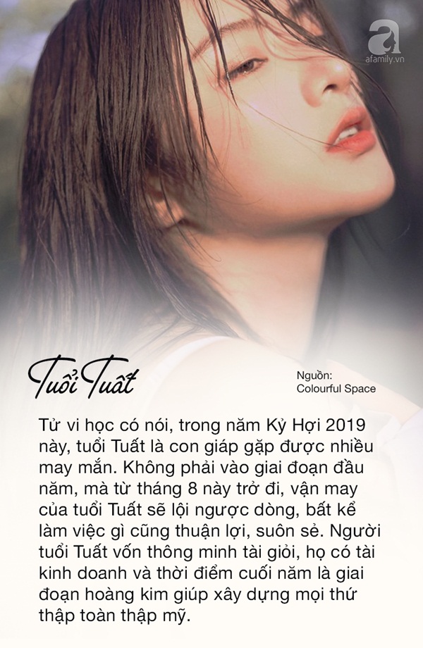 Tử vi học có nói, trong năm Kỷ Hợi 2019 này, tuổi Tuất là con giáp gặp được nhiều may mắn. Không phải vào giai đoạn đầu năm, mà từ tháng 8 này trở đi, vận may của tuổi Tuất sẽ lội ngược dòng, bất kể làm việc gì cũng thuận lợi, suôn sẻ. Người tuổi Tuất vốn thông minh tài giỏi, họ có tài kinh doanh và thời điểm cuối năm là giai đoạn hoàng kim giúp xây dựng mọi thứ thập toàn thập mỹ. Dự kiến trước khi bước qua năm 2020, tuổi Tuất sẽ có cơ hội làm giàu.