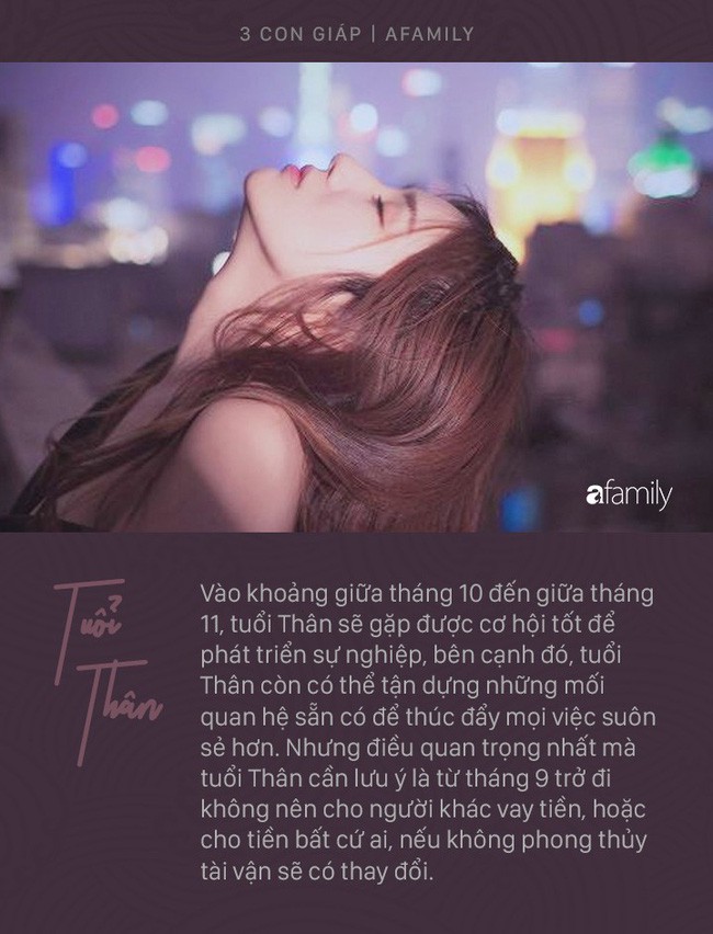 Nhưng điều quan trọng nhất mà tuổi Thân cần lưu ý là từ tháng 9 trở đi không nên cho người khác vay tiền, hoặc cho tiền bất cứ ai, nếu không phong thủy tài vận sẽ có thay đổi. Chỉ cần chờ đợi không lâu, cuộc sống tuổi Thân sẽ lên như diều gặp gió.