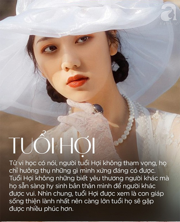 Tử vi học có nói, người tuổi Hợi không tham vọng, họ chỉ hưởng thụ những gì mình xứng đáng có được. Tuổi Hợi không những biết yêu thương người khác mà họ sẵn sàng hy sinh bản thân mình để người khác được vui. Nhìn chung, tuổi Hợi được xem là con giáp sống thiện lành nhất nên càng lớn tuổi họ sẽ gặp được nhiều phúc hơn.