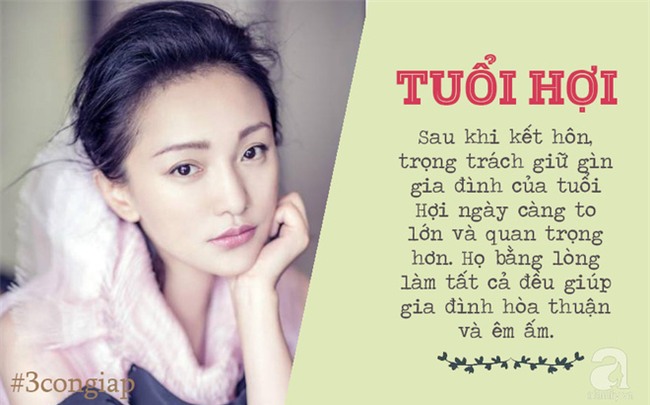 Phụ nữ tuổi Hợi vừa hiền lành, vừa khéo léo, lại còn thật thà, nên khi ai muốn tâm sự với tuổi Hợi đều nhận được những lời khuyên rất chân thành, giúp họ có thể giải tỏa căng thẳng trong cuộc sống. Sau khi kết hôn, trọng trách giữ gìn gia đình của tuổi Hợi ngày càng to lớn và quan trọng hơn. Họ bằng lòng làm tất cả đều giúp gia đình hòa thuận và êm ấm.