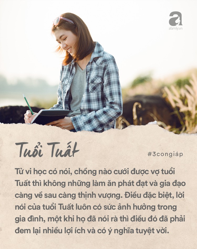 Trong số những con giáp, thì tuổi Tuất là những người thích làm hơn là thích nói. Trời sinh họ sở hữu tính tình thẳng thắn, rõ ràng và cực kỳ trung thành. Trong công việc, tuổi Tuất là là người đáng tin cậy và nhận được nhiều sự tín nhiệm. Trong hôn nhân, họ lại là người vợ có trách nhiệm, biết chăm sóc gia đình và giúp chồng xây dựng cuộc sống hạnh phúc. Đa số những người tuổi Tuất không khéo léo trong cách ăn nói, nhưng những suy nghĩ của họ đều được xem là cao kiến và có quyền lực. Tử vi học có nói, chồng nào cưới được vợ tuổi Tuất thì không những làm ăn phát đạt và gia đạo càng về sau càng thịnh vượng. Điều đặc biệt, lời nói của tuổi Tuất luôn có sức ảnh hưởng trong gia đình, một khi họ đã nói rà thì điều đó đã phải đem lại nhiều lợi ích và có ý nghĩa tuyệt vời. Vì vậy, chồng nên càng nghe lời vợ thì mới mong sự nghiệp thăng hoa rực rỡ, tài vận dồi dào.