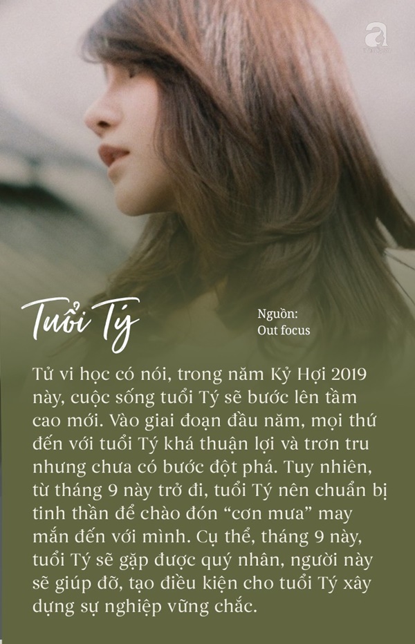 Tử vi học có nói, trong năm Kỷ Hợi 2019 này, cuộc sống tuổi Tý sẽ bước lên tầm cao mới. Vào giai đoạn đầu năm, mọi thứ đến với tuổi Tý khá thuận lợi và trơn tru nhưng chưa có bước đột phá. Tuy nhiên, từ tháng 9 này trở đi, tuổi Tý nên chuẩn bị tinh thần để chào đón "cơn mưa" may mắn đến với mình. Cụ thể, tháng 9 này, tuổi Tý sẽ gặp được quý nhân, người này sẽ giúp đỡ, tạo điều kiện cho tuổi Tý xây dựng sự nghiệp vững chắc, kéo theo thành công vang dội và tài vận dồi dào. Những tháng cuối năm tới đây, tuổi Tý được thần tài và quý nhân chiếu cố nồng hậu, công việc và cuộc sống thăng hoa viên mãn.
