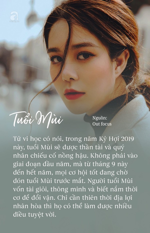 Tử vi học có nói, trong năm Kỷ Hợi 2019 này, tuổi Mùi sẽ được thần tài và quý nhân chiếu cố nồng hậu. Không phải vào giai đoạn đầu năm, mà từ tháng 9 này đến hết năm, mọi cơ hội tốt đang chờ đón tuổi Mùi trước mắt. Người tuổi Mùi vốn tài giỏi, thông minh và biết nắm thời cơ để đổi vận. Chỉ cần thiên thời địa lợi nhân hòa thì họ có thể làm được nhiều điều tuyệt vời. Vào những tháng cuối năm tới đây, tuổi Mùi sẽ gặp được quý nhân phương xa, không những giúp tuổi Mùi xây dựng mọi thứ viên mãn và có thể trở thành mối nhân duyên tốt, giúp tuổi Mùi viên mãn cả tình lẫn tiền.