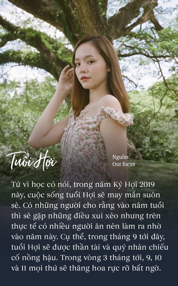 Tử vi học có nói, trong năm Kỷ Hợi 2019 này, cuộc sống tuổi Hợi sẽ may mắn suôn sẻ. Có những người cho rằng vào năm tuổi thì sẽ gặp những điều xui xẻo nhưng trên thực tế có nhiều người ăn nên làm ra nhờ vào năm này. Cụ thể, trong tháng 9 tới đây, tuổi Hợi sẽ được thần tài và quý nhân chiếu cố nồng hậu. Trong vòng 3 tháng tới, 9, 10 và 11 mọi thứ sẽ thăng hoa rực rỡ bất ngờ. Từ sự nghiệp, nhân duyên đến tài vận đều có sự chuyển biến tích cực. Đặc biệt, vào những tháng cuối năm, tuổi Hợi hãy chuẩn bị tinh thần để nghênh đón hỷ sự, có khả năng làm giàu và tận hưởng mọi thứ viên mãn vào những năm sau.