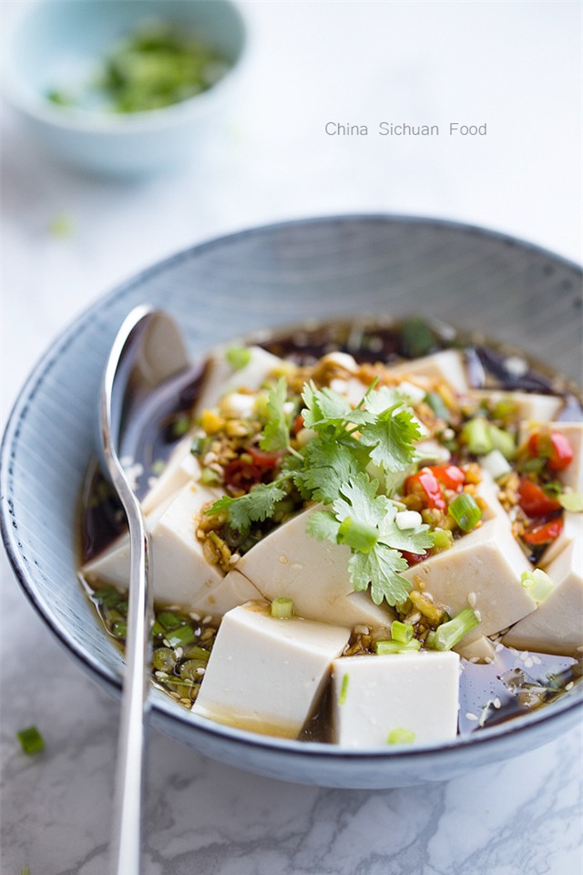 Nguyên liệu: 1 hộp đậu phụ non, 2 cây hành lá (xắt nhỏ), 15ml xì dầu, 15ml dầu mè, 15ml nước, 15ml giấm đen, 2 quả ớt khô, 7g mè trắng rang, 3g đường, 1 củ tỏi (băm nhuyễn), 5g gừng (băm nhuyễn), 2-3 cây ngò (băm nhuyễn)