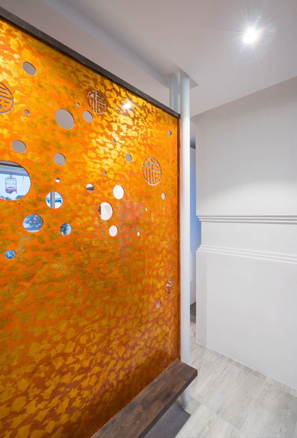 Không gian cũ của căn hộ có tới 3 phòng ngủ. Để tạo sự thông thoáng và bố trí hợp lý hơn, Ngọc Hân và KTS đã bỏ bớt 1 phòng ngủ, tăng không gian sinh hoạt chung và bếp. Phòng thờ sẽ được đặt cạnh không gian sinh hoạt chung, ngăn cách bởi 1 vách thép CNC để tiết kiệm diện tích. Vách thép này được phủ bóng, tạo hoa văn bởi nghệ nhân sơn mài nên mới nhìn qua sẽ rất khó có thể nhận biết được chất liệu thực sự.