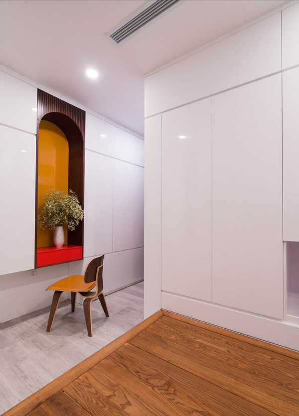 Trong phòng bày trí khá đơn giản nhưng tinh tế, hệ tủ âm tường giúp tiết kiệm diện tích.
