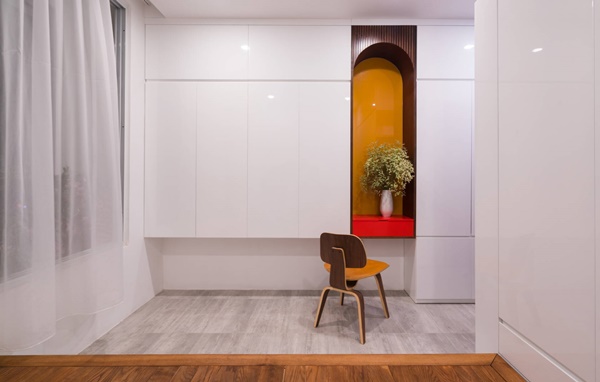 Điều thú vị khác trong căn hộ chính là "căn bếp âm tường". Bếp được đặt lùi vào trong tường khoảng 1.5m tạo được sự gọn gàng cho không gian. 2 phòng ngủ khá đơn giản, điểm nhấn là hệ thống cửa vòm và giường ngủ dạng phản gỗ kê lên trên ngăn kéo trữ đồ.