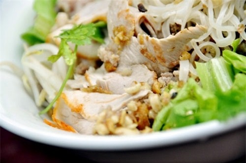 sợi phở ăn hàng ngày trộn với thịt xá xíu thái mỏng, lạc rang, hành khô