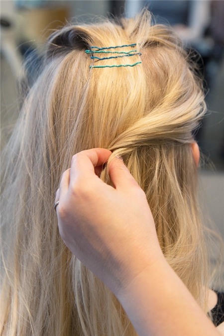 Tiếp tục xoắn tóc - cố định bằng cặp tăm với phần tóc ở gáy.