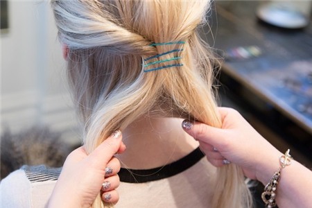Với phần tóc ở gáy, sau khi xoắn, bạn hãy cố định nó chung với búi tóc phía trên.