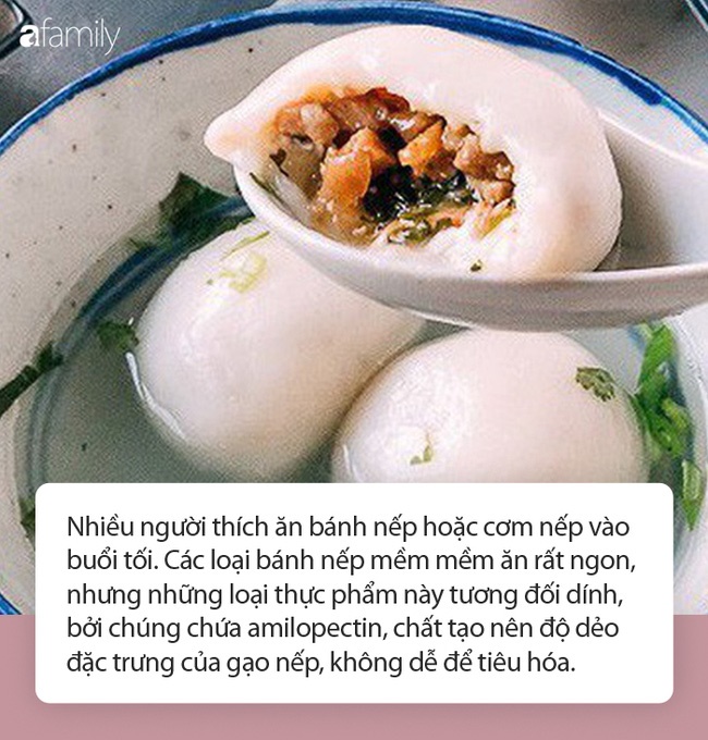 Nhiều người thích ăn bánh nếp hoặc cơm nếp vào buổi tối. Các loại bánh nếp mềm mềm ăn rất ngon, nhưng những loại thực phẩm này tương đối dính, bởi chúng chứa amilopectin, chất tạo nên độ dẻo đặc trưng của gạo nếp, không dễ để tiêu hóa. Nếu ăn thường xuyên các sản phẩm từ gạo nếp sẽ làm tăng gánh nặng lên đường tiêu hóa, ảnh hưởng đến chất lượng giấc ngủ.
