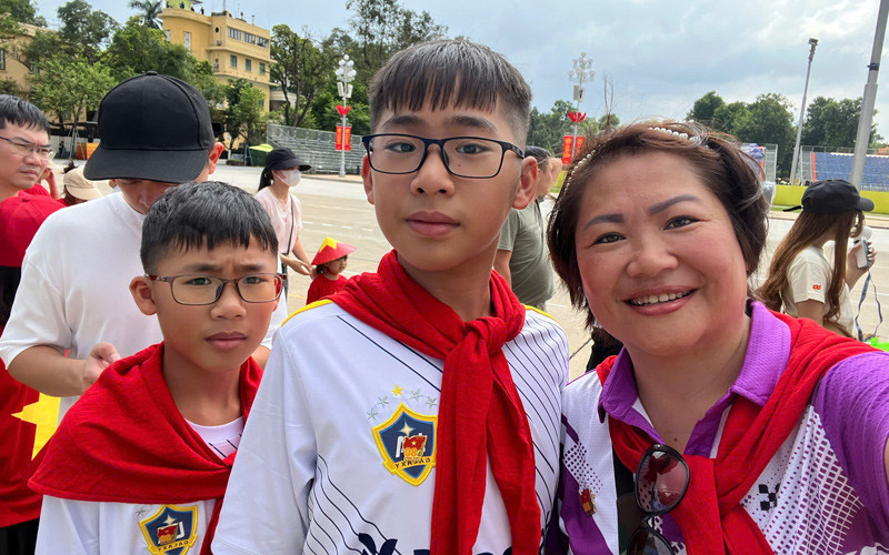 Sáng 24/8, chị Nguyễn Thu Hằng (48 tuổi, Điện Biên) cùng con trai song sinh Bình An và Bảo An (13 tuổi) đã có mặt tại Quảng trường Ba Đình (Hà Nội). Ba mẹ con hòa mình vào dòng người xem buổi hợp luyện diễu binh lần thứ hai, hướng tới kỷ niệm 80 năm Quốc khánh 2/9.