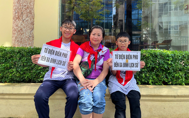 “Tôi in tấm biển ‘Từ Điện Biên Phủ đến Ba Đình lịch sử’ cho 2 con đeo trước ngực, mọi người nhìn thấy đều cổ vũ rất nhiều”, chị Hằng kể.