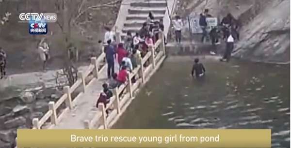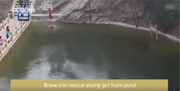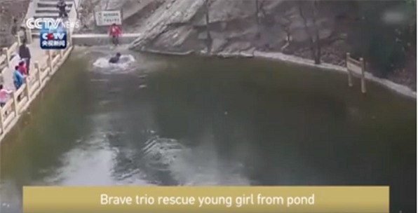 Một camera giám sát tại Guanyun, tỉnh Giang Tô, Trung Quốc đã ghi lại khoảnh khắc 3 người đàn ông dũng cảm cứu một cô bé 13 tuổi ngã xuống hồ nước khi đang chơi.