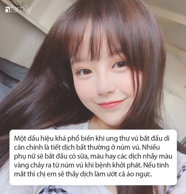Một dấu hiệu khá phổ biến khi ung thư vú bắt đầu di căn chính là tiết dịch bất thường ở núm vú. Nhiều phụ nữ sẽ bắt đầu có sữa, máu hay các dịch nhầy hôi có màu chảy ra từ núm vú khi bệnh khởi phát. Nếu tinh mắt thì chị em sẽ thấy dịch làm ướt cả áo ngực.