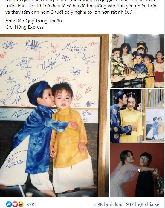 "Đó là một khoảnh khắc tình cờ nhưng bố mẹ của cả hai bên đều quá thích thú nên đã chụp lại làm kỷ niệm. Không ngờ 23 năm sau lại được anh chị tái hiện lại theo cách thức mĩ mãn đến vậy", Thuận chia sẻ.