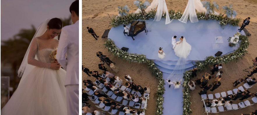 Được biết NTK Chung Thanh Phong đã mất tới 6 tháng để hoàn thiện 2 mẫu váy cưới này. Thân váy được đính đá swarovski trong suốt lấp lánh lấy cảm hứng từ những giọt sương mai. Phần veli có độ dài tới 5 mét.