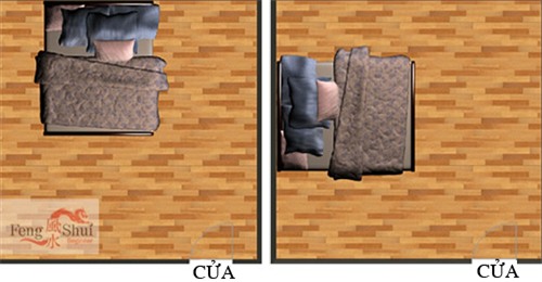 Giường nên được đặt vào một bức tường vững chắc và đường chéo đối diện với cửa phòng. Bên cạnh đó, có thể lên giường được từ cả hai phía.