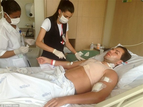 Rodrigo cho biết, anh đã trải qua hơn 20 lần dao kéo. Do thời gian giữa những cuộc đại phẫu quá ngắn nên anh gặp phải biến chứng nguy hiểm. Trong đó, ca phẫu thuật tiêm gel kích thích cơ bắp từng khiến chàng trai Brazil suýt mất mạng. Anh bị nhiễm trùng nghiêm trọng, không thể tự ăn hay tắm rửa cho mình. Ảnh: Daily Mail.