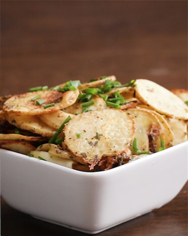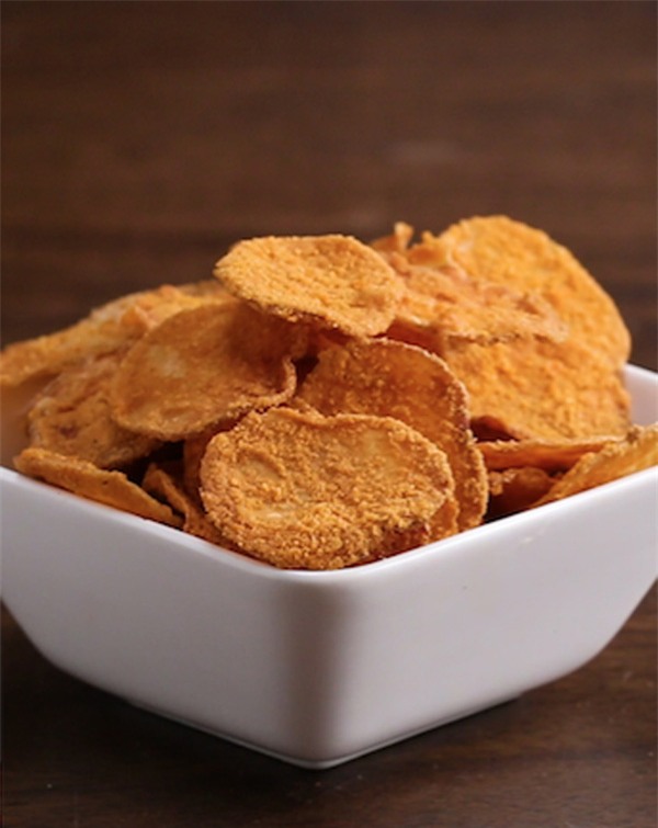 1. Làm nóng lò nướng đến 350ºF / 175ºC. 2. Khoai tây rửa sạch rồi thái mỏng hoặc dùng dao bào, cẩn thận bào mỏng khoai tây thành từng lát cho nhanh. 3. Cho bánh cheddar vào một túi ziplock và nghiền nát chúng cho đến khi thành dạng bột mịn. 4. Chuẩn bị một bát lớn, trộn đều khoai tây với dầu, bột cheddar và muối. 5. Xếp khoai tây vừa ướp lên lò nướng đã phết một lớp dầu mỏng. Nướng trong 30-35 phút là được. |