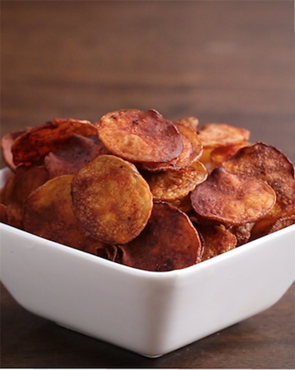 1. Làm nóng lò nướng trước đến 350ºF / 175ºC. 2. Khoai tây rửa sạch rồi thái mỏng hoặc dùng dao bào, cẩn thận bào mỏng khoai tây thành từng lát cho nhanh. 3. Chuẩn bị một bát lớn, cho khoai tây vào trộn đều với các thành phần gồm: 1 muỗng canh dầu ăn; 1 muỗng canh ớt bột; 2 muỗng canh đường nâu; 1 thìa cà phê bột tỏi; 1 muỗng canh ớt; 1 muỗng canh muối. 4. Xếp khoai tây vừa ướp lên lò nướng đã phết một lớp dầu mỏng. Nướng trong 30-35 phút là được. |