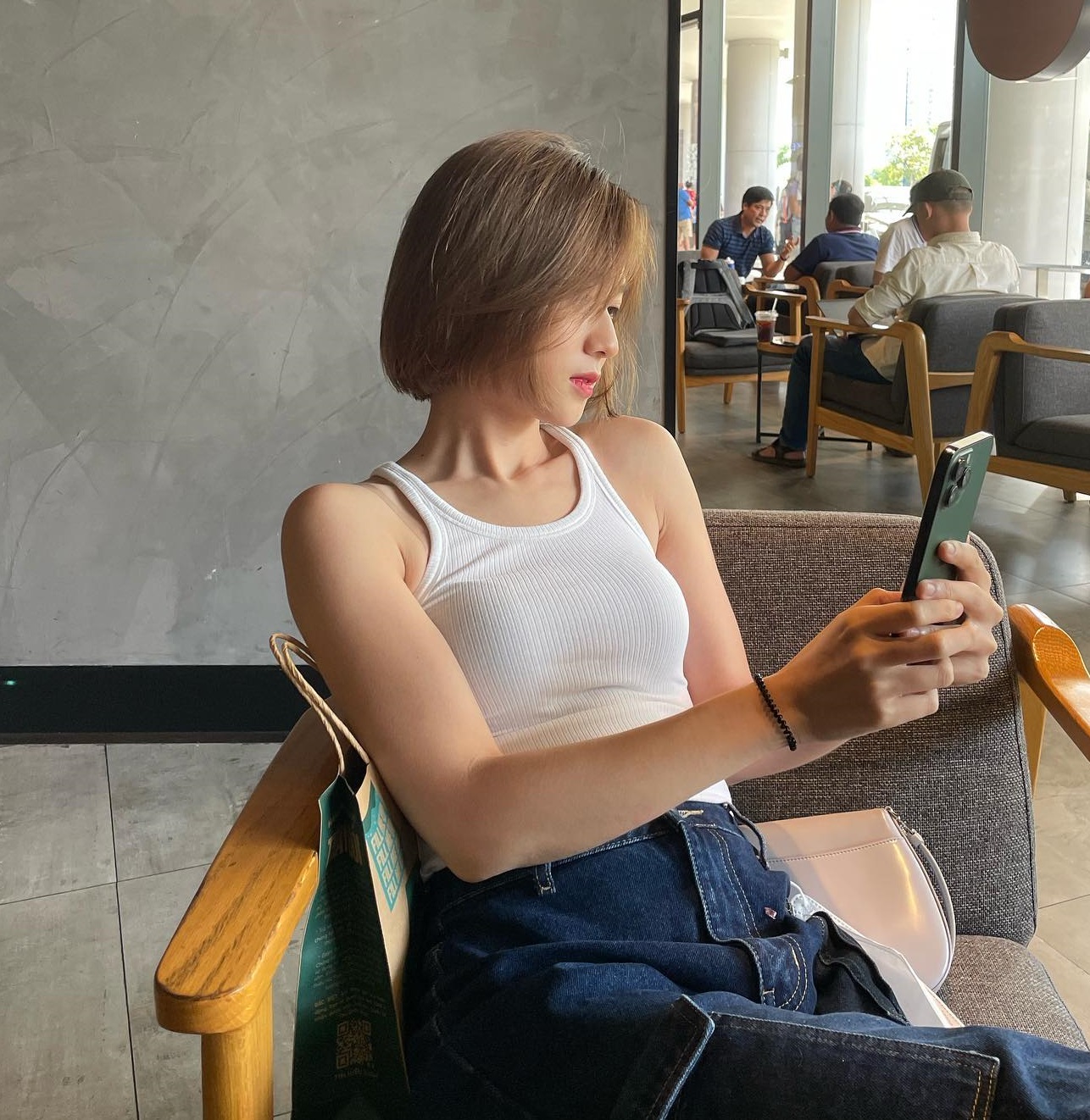 Hot mom Trâm Anh chọn màu nhuộm nâu hạt lanh cho mái tóc ngắn. Màu nhuộm này giúp diện mạo của Trâm Anh trở nên rạng rỡ và nổi bật. Bên cạnh đó, tông màu nâu hạt lanh vẫn đảm bảo sự trang nhã, tinh tế cho diện mạo. Với kiểu tóc ngắn, nhuộm sáng màu, chị em hãy chăm chút mái tóc bằng các sản phẩm như dầu gội và xả chuyên dụng, dầu dưỡng hoặc mặt nạ ủ. Như vậy, mái tóc sẽ có độ bóng mượt, khỏe khoắn.