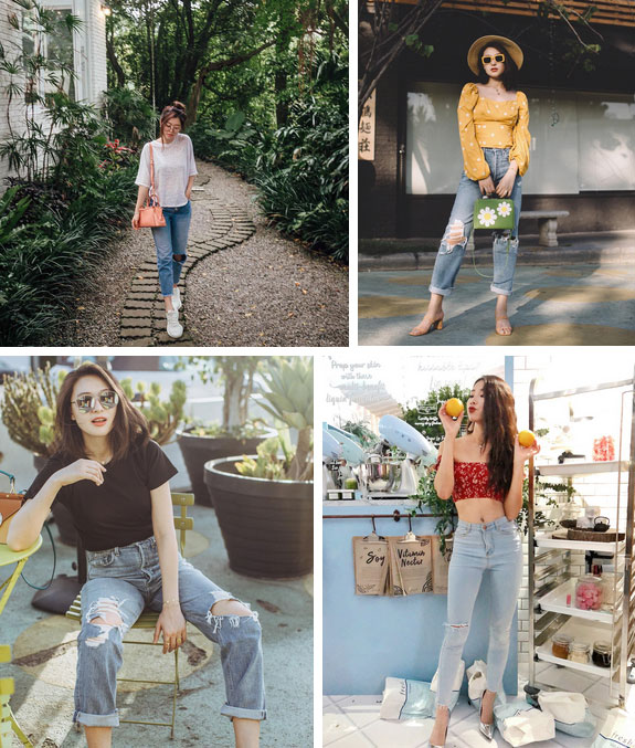 Cũng bụi bặm và phóng khoáng chẳng kém gì shorts cắt gấu, jeans rách là item không một cô nàng sành mốt nào có thể bỏ qua. Tùy vào cá tính thời trang của mình, các nàng có thể chọn mẫu jeans với thật nhiều khoảng rách cá tính hay chỉ nhấn nhá một chút cho thêm phần ấn tượng. Diện item này với áo phông, đi giày sneakers là tuyệt đối khỏe khoắn, năng động. Tuy nhiên, có rất nhiều cô nàng đã phá cách bằng việc mix item siêu cá tính này với áo blouse hay croptop điệu đà rồi đi giày cao gót và quả thực, set đồ này cũng mang lại vẻ nữ tính, quyến rũ khó cưỡng.