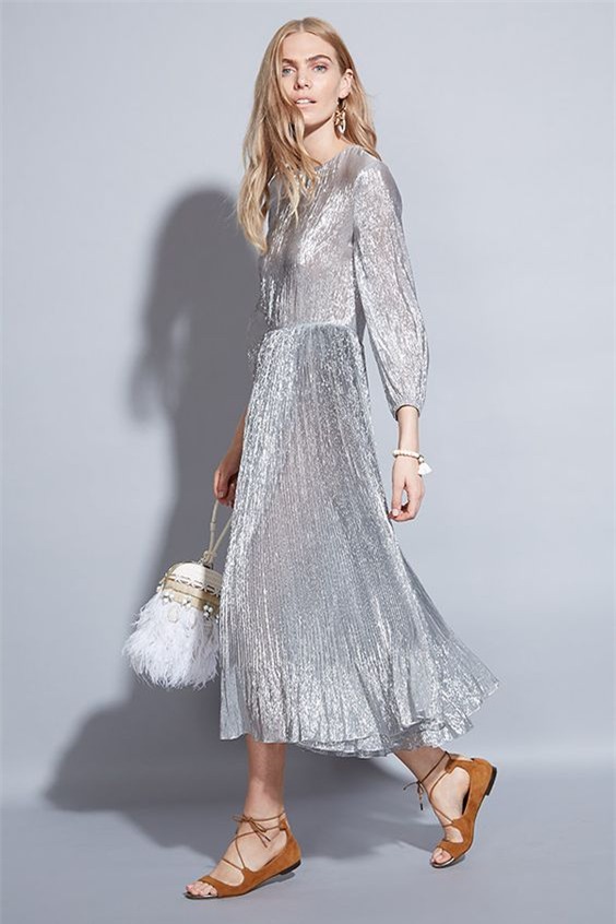 Bên cạnh sắc đỏ, chất liêu ren hay vải nhung thì thiết kế váy được ưa chuộng nhất trong các dịp lễ hội, tạo hiệu ứng tối đa về mặt thị giác cho các cô nàng sành điệu đó chính là trang phục ánh kim, lấp lánh. Sẽ không có gì ngạc nhiên nếu bạn trở thành tâm điểm của một bữa dạ tiệc khi khoác lên mình chiếc váy liền quyến rũ này kết hợp cùng sandals gót nhọn cùng tông và bên ngoài khoác thêm một chiếc áo lông hờ hững. Sự sang trọng, quý phái sẽ được phát huy một cách tối đa đấy.