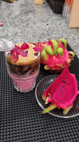 Thoạt nhìn qua, ly cà phê thanh long này trông khá bắt mắt và có phần cuốn hút bởi hiếm có ly cà phê sữa nào phân tầng nâu - hồng thế này. Các pha cà phê thanh long cũng rất đơn giản. Bạn chỉ cần dằm nhuyễn khoảng 30gr thanh long đỏ, cho vào cốc cùng 30ml sữa đặc, 50ml sữa tươi và khuấy đều. Sau đó thêm đá viên và 30ml cà phê đen đánh bọt cùng vài miếng thanh long cắt nhỏ lên trên là xong.